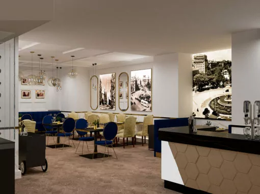 Para conjugar diferentes ambientes en el hotel, pasamos por la castañera, el churrero y las distintas fuentes de Madrid. Así, los visitantes y comensales se sentirán parte de su historia.